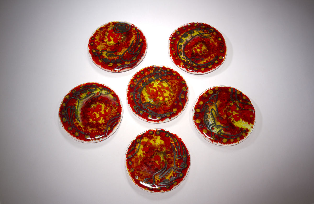 Set of 6 hand-painted Aboriginal art glass coasters.