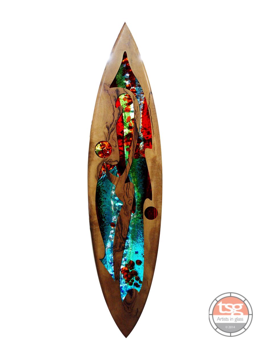 This custom art glass surfboard is made from glass we have fused in our kiln. This surfboard is mounted in a solid, 40mm thick marri frame. This results in a unique product unlike anything else in the world. Each piece is made made to order so please note that there may be some differentiation between the image and the product you receive.